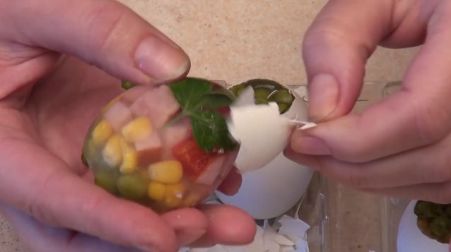 7. Заполнить яйца на 3/4 части красиво укладывая внутрь ингредиенты.