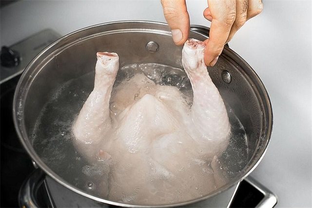 - Налить в глубокую кастрюлю воду, окунуть тушку птицы и отправить на огонь, доведя до кипения. Слить жидкость, снова залить чистой водой и поставить вариться повторно.