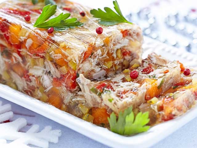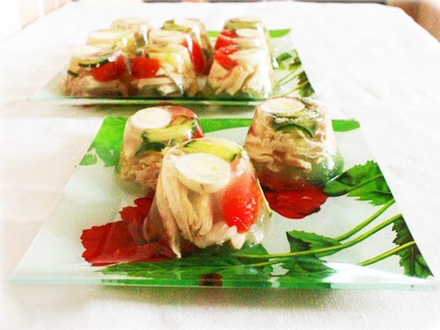 Как Вы наверное успели заметить, все рецепты даются практически по одной схеме. Готовится бульон, готовится желе. Затем форма наполняется ингредиентами и заливается бульоном с желатином. Затем ставится в холодильник и остужается.