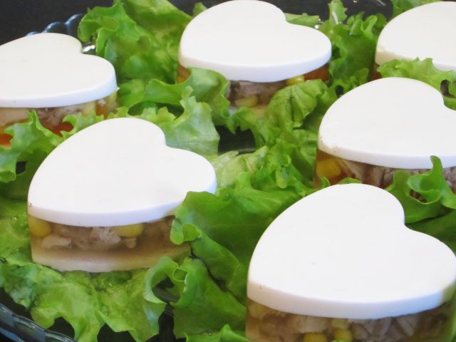 10. Перед подачей на стол опустить форму с заливным в горячую воду, достать, слегка встряхнуть и перевернуть на тарелку.