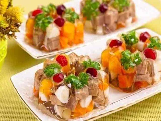 Если же не хотите выкладывать мясо красивыми слоями, ну к примеру, когда готовите его в будни, то просто разберите мясо на волокна, выложите в форму. Затем украсьте овощами, и залейте слоем желе нужного объема.