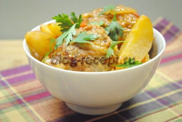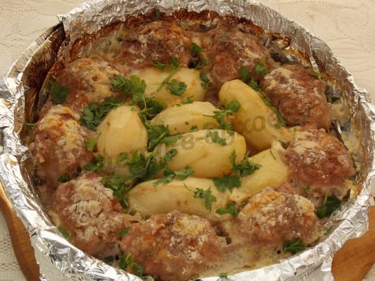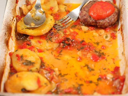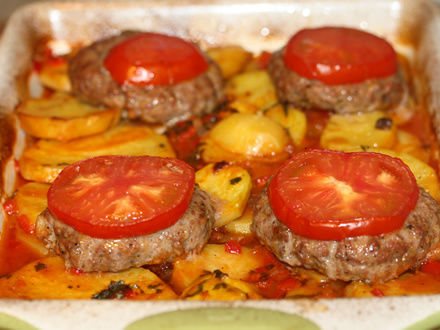 Предлагаю приготовить второе блюдо, которое запекается в духовке, — котлеты с картошкой в томатном соусе, все вместе и сразу. Я не решилась оставить картофель сырым, так как в кислой среде он долго запекается. Поэтому отварила его заранее. Получилось вкусно и необычно, по-восточному. За рецепт благодарю Семирамиду.