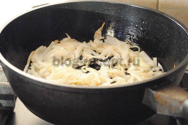 - Тем временем готовим подливу. Для нее нарезаем луковицу полукольцами.