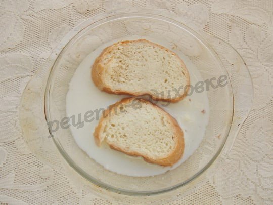Два кусочка хлеба залить молоком и дать постоять до размокания. Можно взять белый хлеб, но мы любим черный.