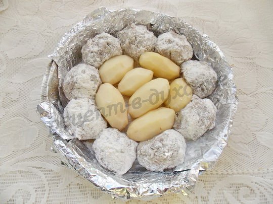 - Затягиваем плотно фольгой и убираем в духовой шкаф на 45 минут или до готовности картофеля.