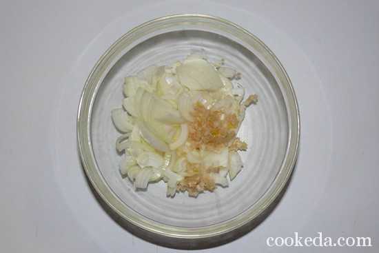 1. Для будущего маринада нарезаем полукольцами лук и выдавливаем через пресс (или трем на терке) чеснок.