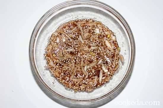 - В миске соединяем 1/3 соуса из соевых бобов и измельченные компоненты.