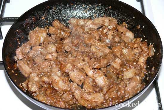 Когда вся жидкость выпарится, а лук и мясо слегка подрумянятся (на это потребуется около 20 минут), жареную свинину по-корейски можно подавать к столу.