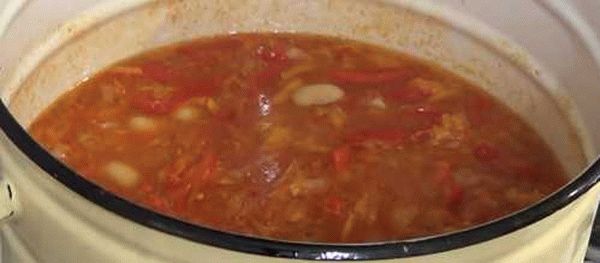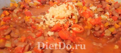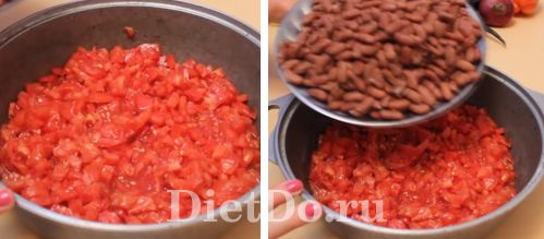 - Через 15 мин. добавить к томатам приправы. Спустя еще 15 минут добавить в кастрюлю стручковую фасоль и обжаренные овощи. Всю смесь держать на огне 20 минут.