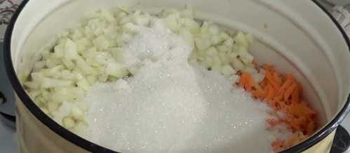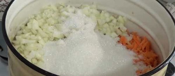 - Соль, специи (перец, лавр), сахар, уксус прибавляю к массе за 5 минут до готовности.
