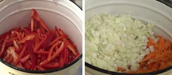 - Морковку и лук нарезать и обжарить.