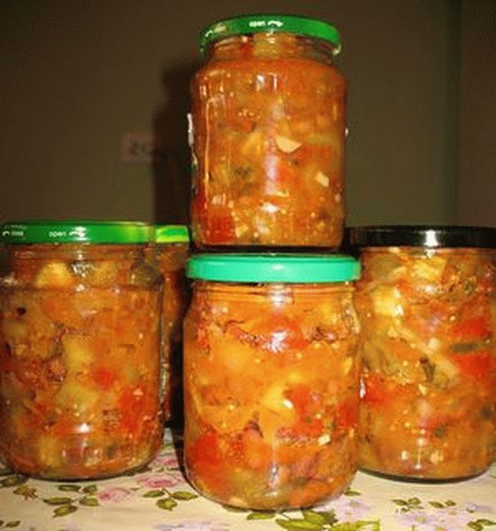 Подготовить стеклянные банки. Вымыть и простерилизовать любым удобным способом. Выложить горячий салат из сковороды в тару и закатать крышками. Оставить охлаждаться под одеялом в перевернутом виде. Затем, убрать салат из овощей в прохладное место до зимы.