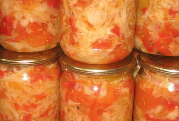 Горячие овощи расфасовать по стерилизованным банкам и закатать. Уложить салат вверх дном в плед и оставить там до полного остывания. Далее, убрать в кладовку или погреб.
