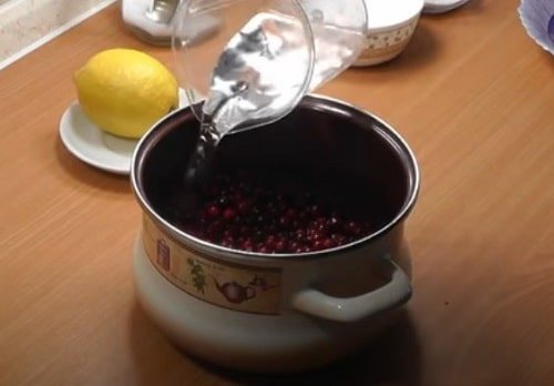 - Влейте в кастрюлю воду, забросьте бруснику, дайте закипеть.