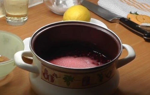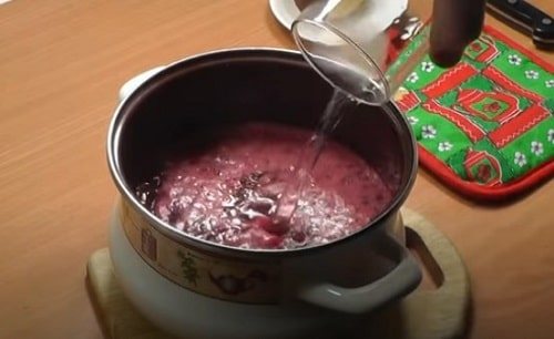 - Ягоду залить водой, добавить к ней сахар и пять минут проварить, помешивая.