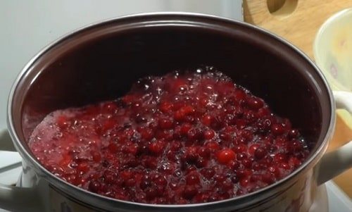 - Заложите бруснику, поставьте на конфорку. Доведите до закипания, варите на малом огне примерно 10 минут.