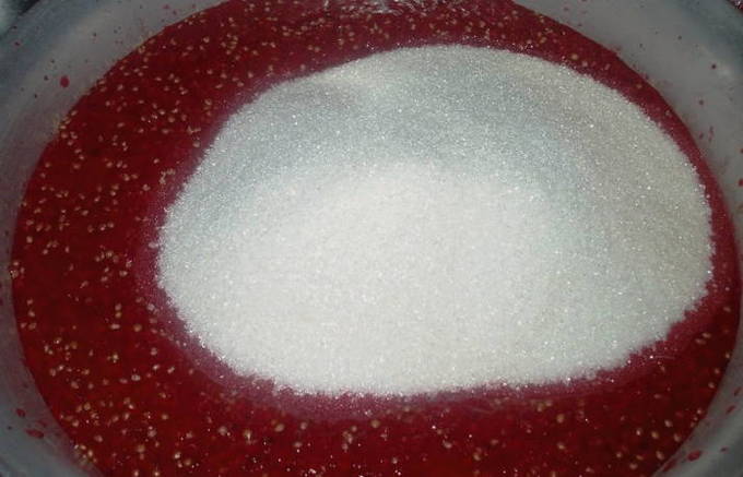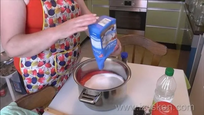 - Добавляем в кастрюлю с соком 1 килограмм сахара и стакан уксуса.