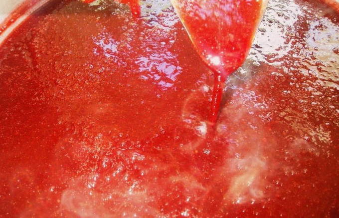 - Уварите на среднем огне до уменьшения объёма вдвое, протрите массу через сито.