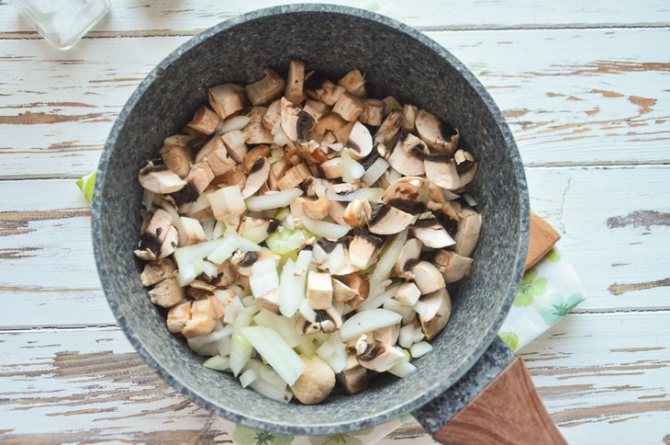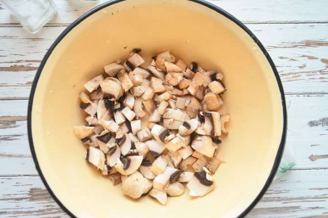 1. Шампиньоны можно использовать как свежие, так и мерзлые – причем необязательно ждать, пока они оттают. Свежие грибы помойте и мелко порубите.