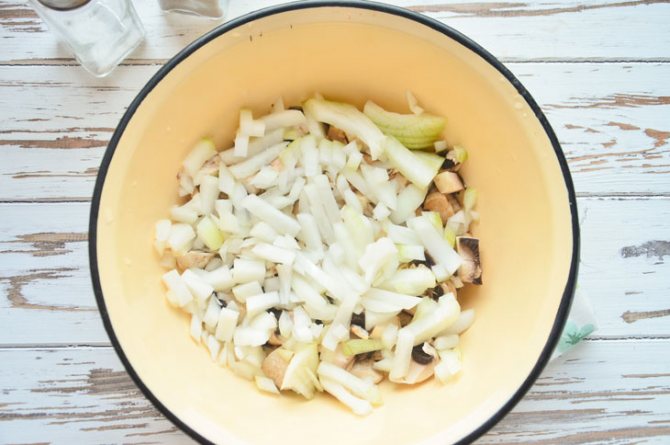 3. Грибы с луком отправьте в кастрюлю, сотейник или сковороду с высокими бортами. Влейте пару ложек масла для жарки и обжарьте продукты в течение 6-7 минут, помешивая лопаткой.
