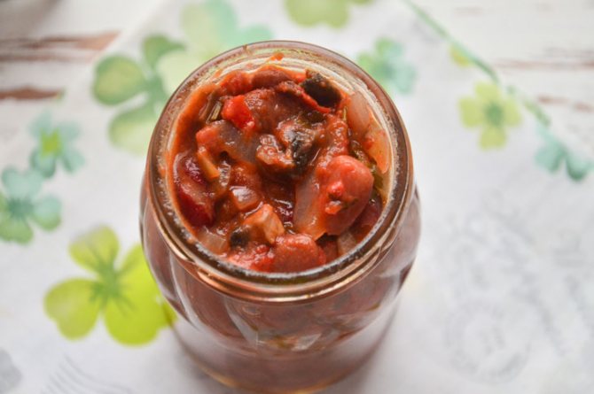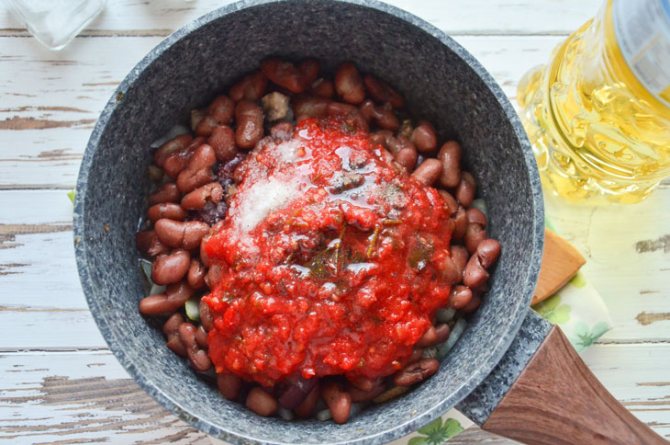 В кастрюлю кладем томаты, предварительно порезанные кольцами, обжаренные овощи, фасоль. Добавляем соль, сахар, масло, закуску перемешиваем, тушим смесь двадцать пять минут при закрытой крышке.