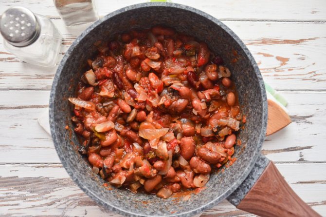 4. Фасоль лучше сварить заранее и этот момент существенно сократит время приготовления закуски. Вареную фасоль отправьте в сотейник к грибам.