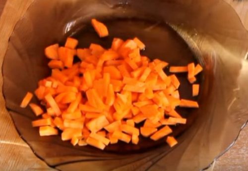 Измельчите морковь. Кусочки по размеру должны быть примерно, как чечевица.