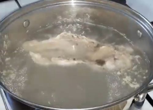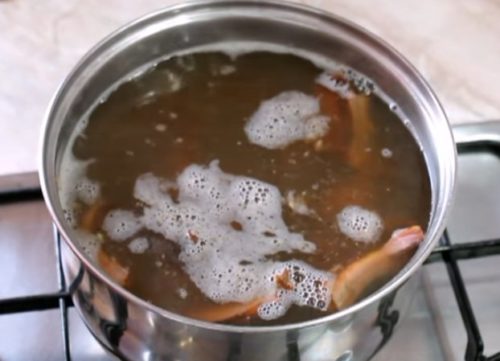 2. Доведите воду в количестве по рецептуре до кипения. Закиньте куриные ломтики на варку, ждите 25 минут. Своевременно убирайте накипь.