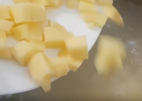 Нарежьте картофель кубиками. Пересыпьте в бульон. Варите 5 минут.