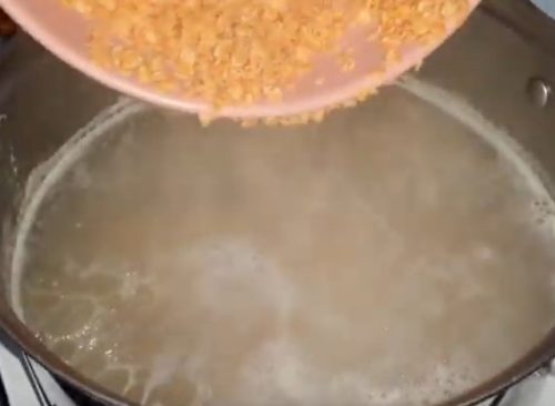 Промойте и замочите на 5 минут чечевицу. Отправьте в суп. Варите 10 минут.