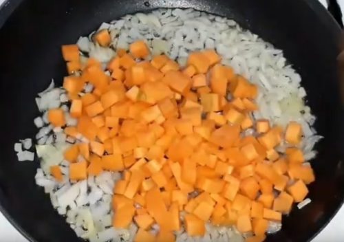 Влейте в сотейник масло. Засыпьте луковые кубики. Жарьте до прозрачности. Добавьте морковь. Постоянно перемешивая потушите 5 минут.