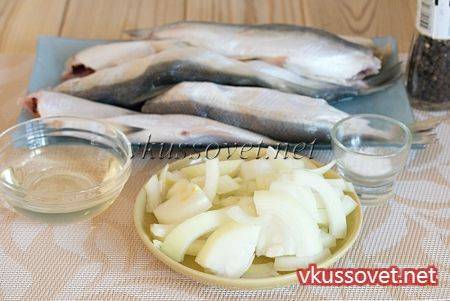 Для приготовления ряпушки на сковороде с луком возьмите: ряпушку, репчатый лук, растительное масло, воду, соль и черный молотый перец по вкусу.