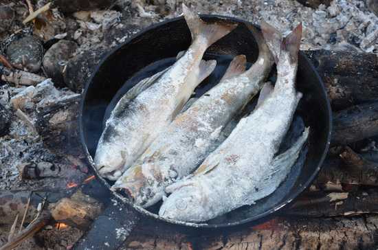 Свежую рыбу посолить, поперчить, удалить жабры, завернуть в 2-3 слоя фольги и закопать в горячую золу под костром или засыпать горячими углями. Через 30-40 минут рыба будет готова. Готовность рыбы зависит от величины запекаемой рыбы и от интенсивности жара.