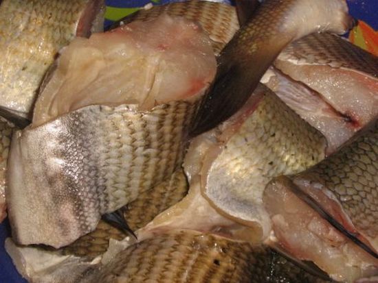 Первое, что нужно сделать, — это очистить рыбу от чешуи, удалить голову, плавники и хвост. Затем разрезать вдоль и избавиться от внутренностей. После этого очень хорошо промыть ее и разделить на части. Подготовленную таким образом рыбу нужно выложить в глубокую кастрюлю и насыпать черного перца и соли. Перемешать и оставить на двадцать пять минут, чтобы рыба выделила сок и пропиталась солью и перцем.