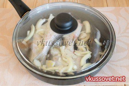 На сковороду (желательно чугунную) налейте масло, сверху выложите рыбку и лук.