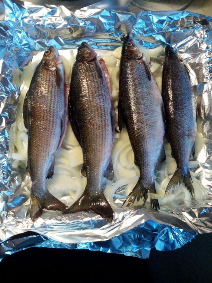 Запеченный в фольге хариус с луком