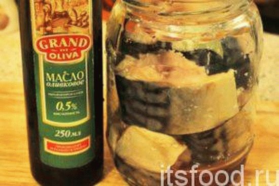 Консервы по этому рецепту готовятся в духовке. Но перед этим сначала нужно вымыть, вырезать и выпотрошить рыбу, нарезать ее кусочками и утрамбовать банку. Затем добавить чайную ложку соли, перец горошком и залить растительным маслом так, чтобы до края банки оставалось 2 см (примерно 200 мл масла). Стеклянную банку поставить в духовку на мокрый песок. Установить температуру нагрева 180 градусов, через 15 минут уменьшить ее до 110 градусов и томить скумбрию в масле еще 4 часа.