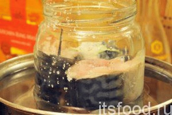 На дно глубокой кастрюли помещаем небольшое блюдце и наливаем воду на одну треть объема кастрюли. Ставим банку с будущими консервами в кастрюлю, прямо на блюдце. Доливаем воду и начинаем разогрев и кипячение домашних консервов из скумбрии на водяной бане. Банку с консервами желательно прикрыть капроновой крышкой.