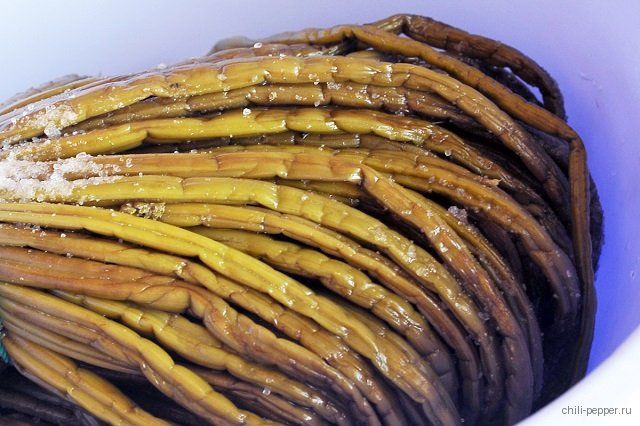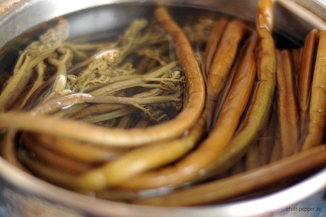 Солёный папоротник орляк также необходимо перед приготовлением вымачивать в течение 4-12 часов для уменьшения соли. Затем его отваривают 10 минут после закипания.