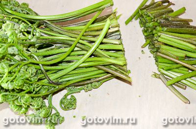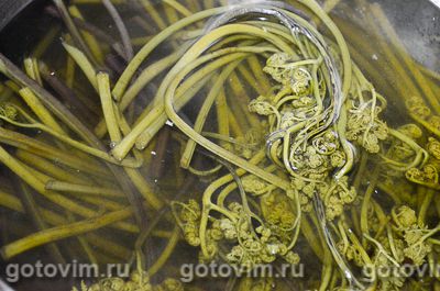 Папоротник перебрать, разрезать на 3 части, промывать его не надо, закинуть в кипящую воду и варить примерно минут пять, стебли должны быть мягкими, но не разваливаться.