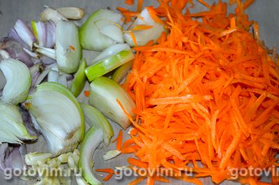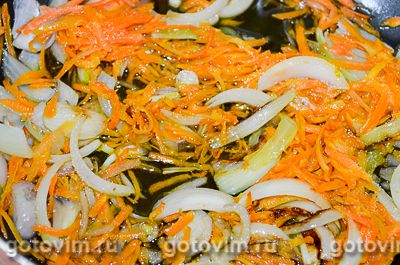- Головку лука и 2 большие моркови нарезаем мелко и обжариваем в небольшом количестве масла.