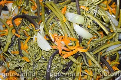 Подготовить побеги папоротника, как было рассказано выше, т.е. замочить, а затем немного поварить. Морковь почистить и порезать кубиками. Величина кубиков большого значения не имеет, но чем они мельче, тем вкуснее получится готовое блюдо. Лук и чеснок мелко порубить. Измельчённые овощи обжарить в растительном масле до золотистого цвета. После этого выложить к ним ростки папоротника и жарить до готовности, периодически помешивая содержимое сковороды.