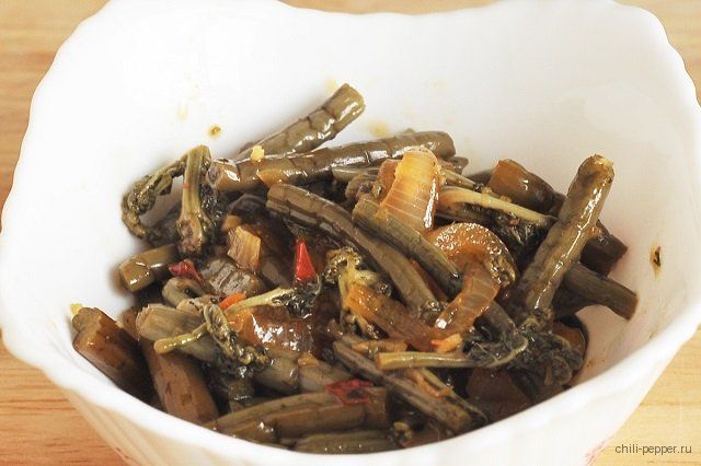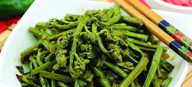 В небольшом количестве масла обжарить мелко порезанный лук, чтобы он приобрёл золотистый оттенок. Предварительно подготовленные побеги папоротника нарезать на кусочки и отправить к луку. Сразу же в сковороду следует добавить соевый соус, раздавленный прессом чеснок, приправу и перец чили. Содержимое как следует перемешать и тушить с закрытой крышкой пару-тройку минут.