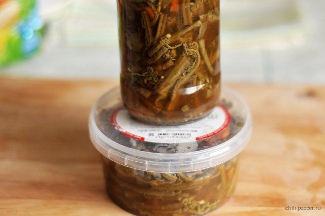 Процедуру с перекладыванием папоротника повторяем еще раз, и только после этого полуфабрикат готов к хранению. Перед приготовлением соленых черенков их нужно вымачивать в течение двух суток, при этом регулярно менять воду.