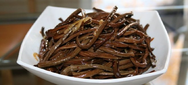 Для набухания размочите в воде (в течение 12 часов) 100 г сухого растения орляка. Далее стебли выложите на сковородку с 50 мл масла и жарьте 5–10 минут.