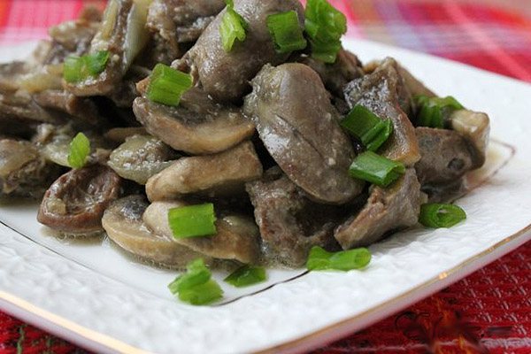 - Салат из сердца – с жареными грибами и зеленым горошком