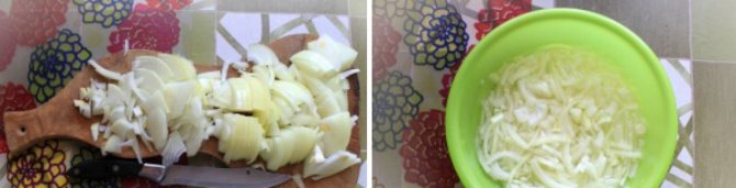 - Сразу займемся репчатым луком, так как ему нужно время промариноваться. Очищаем его от шелухи, нарезаем полукольцами. Заливаем овощ смесью воды с уксусом в равных пропорциях, добавляем немного сахара и соли для вкуса. Маринуем 2 часа.
