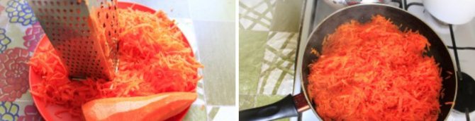 - Морковь очищаем, моем и нарезаем тонкой соломкой. Можно воспользоваться теркой для корейской моркови. Обжариваем овощ на сковороде с небольшим количеством подсолнечного масла. Жарим до мягкости моркови.