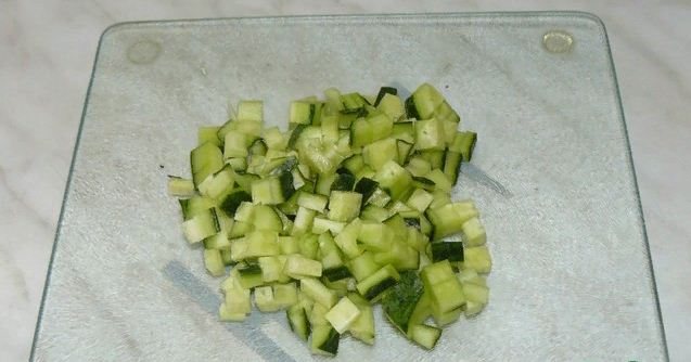 - Слить рассол с огурцов, обрезать хвостики и нарезать соломкой. Отжать лишнюю жидкость.