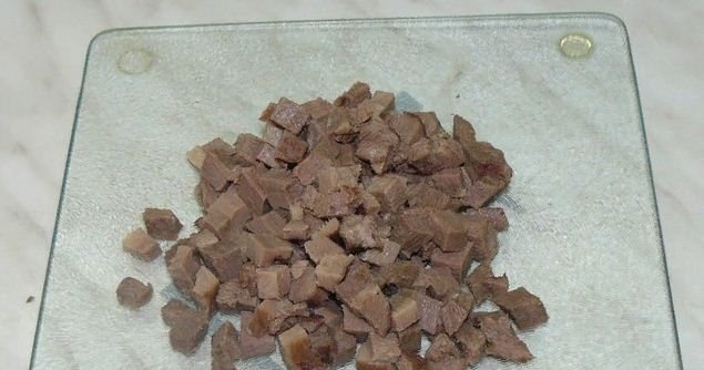 - Остывшее сердце достаем из бульона и нарезаем кубиками среднего размера.